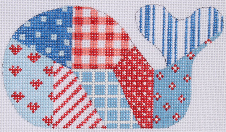 OM-185 Mini Whale – Patchwork – red, white & blue - TS, 18, mesh, Handpainted by Kate Dickerson, Design Size: 4¾ x 2½ inches