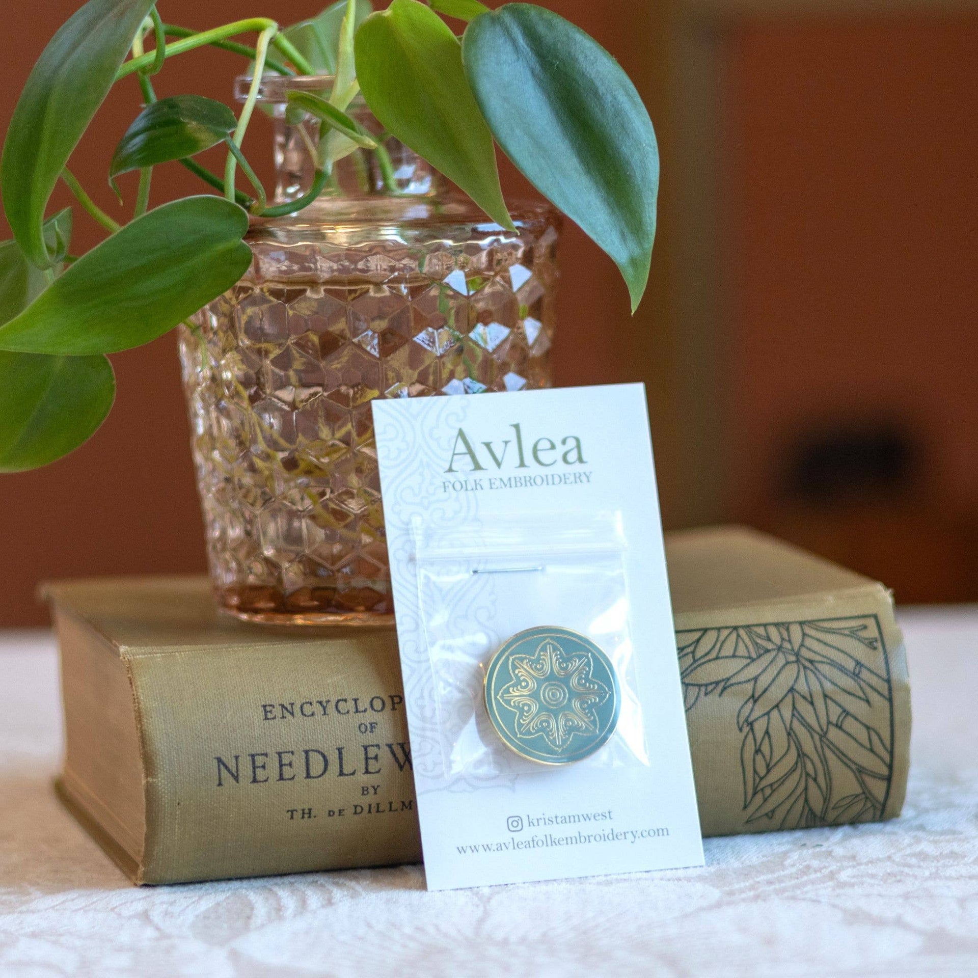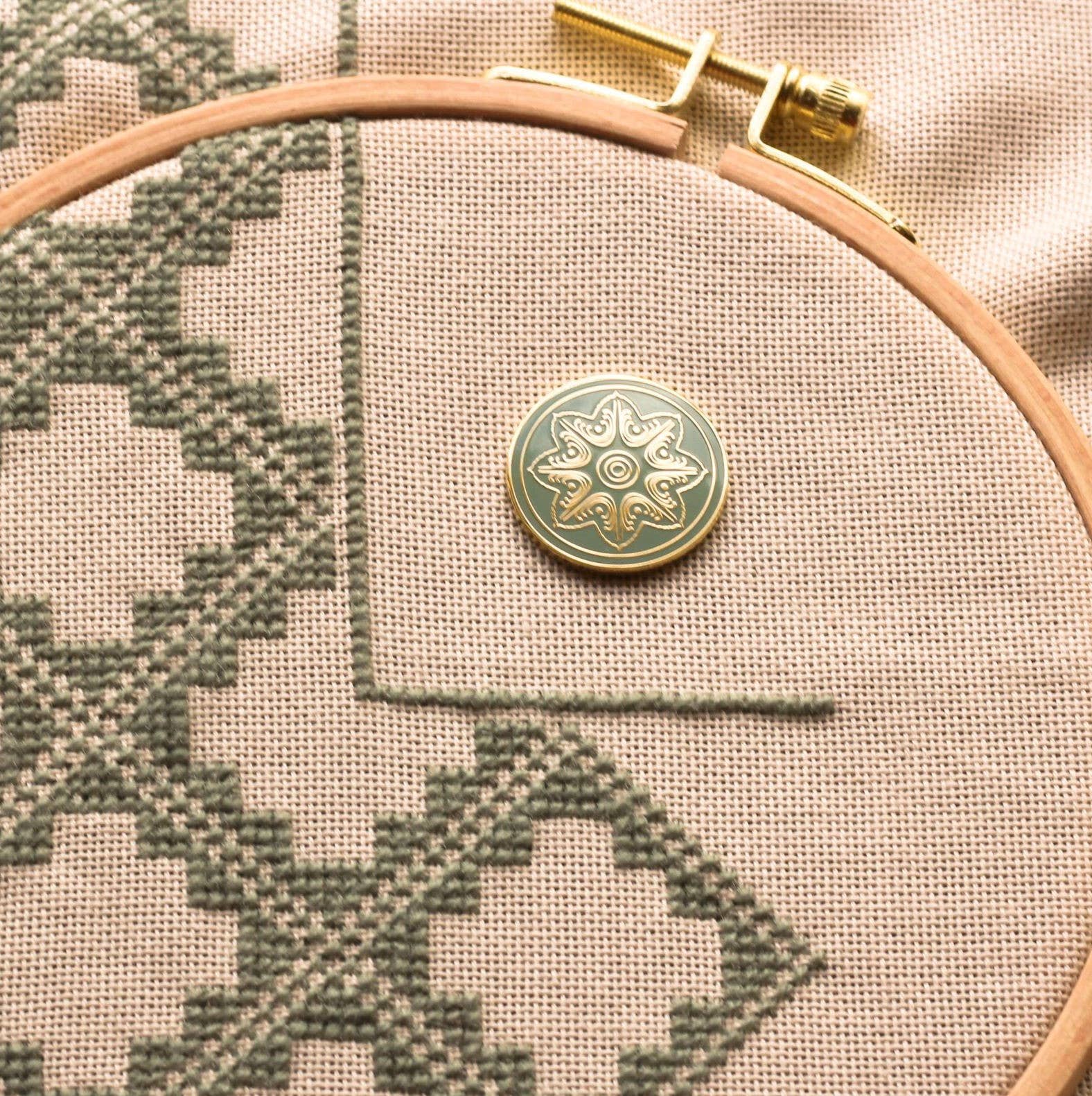 The Daphni needle minder is inspired by laurel leaves ("daphni" in Greek), a motif found throughout the Classical world. Its graceful design glows from a celadon background. Needleminders are terrific for not just holding your needle when not in use, but for securing your fabric as you stitch, or holding your pattern to your frame. They can even be worn as a beautiful magnet pin! Needleminder is 1" across and comes with a 1/2" neodinum magnet (it's strong!)