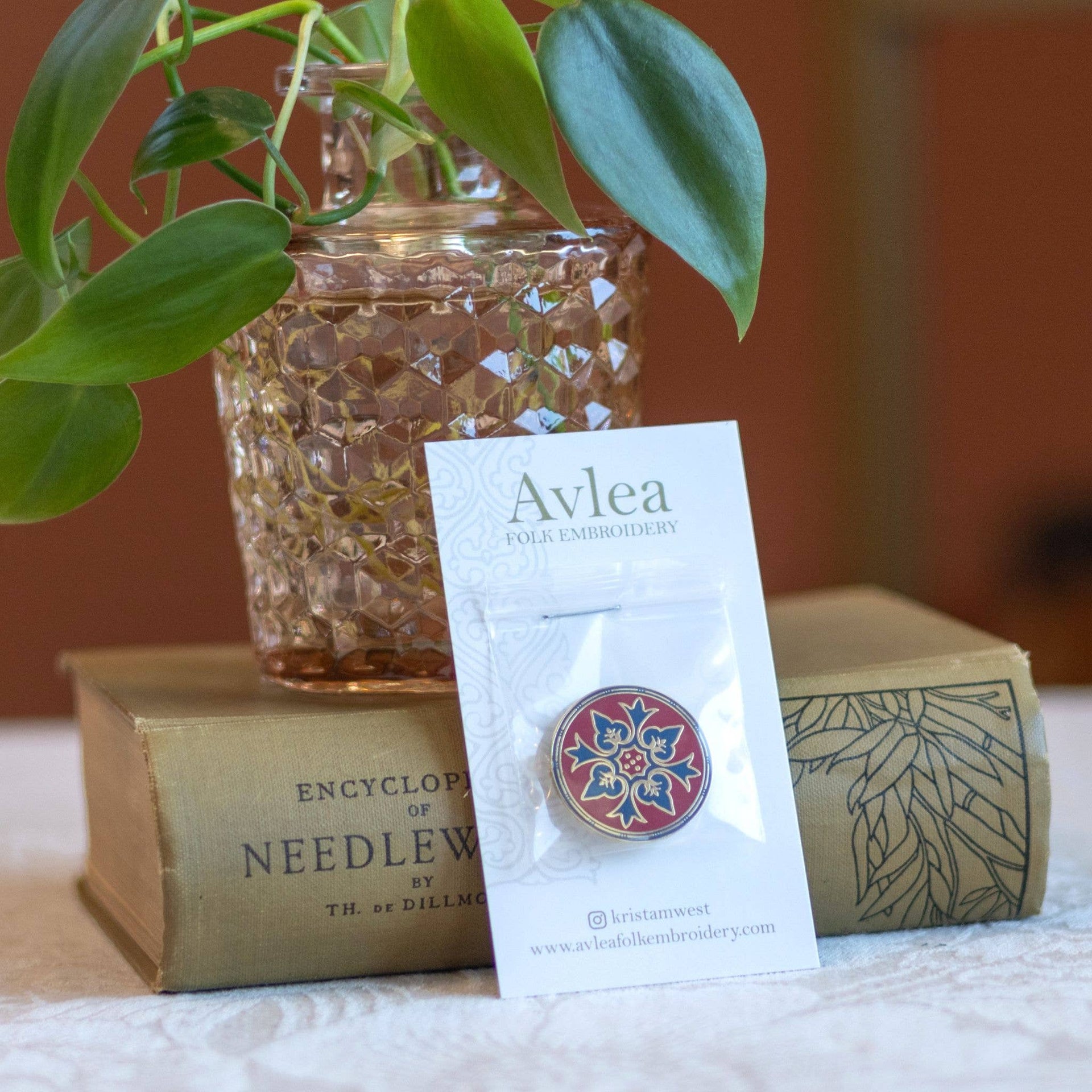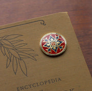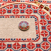 The Justina needle minder is a graceful leaf design in the striking shades of red and blue which were highly favored in Byzantine and medieval art. Needleminders are terrific for not just holding your needle when not in use, but for securing your fabric as you stitch, or holding your pattern to your frame. They can even be worn as a beautiful magnet pin! Needleminder is 1" across and comes with a 1/2" neodinum magnet (it's strong!)