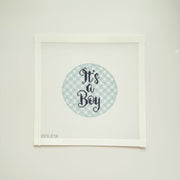 This stitch painted needlepoint canvas features the phrase "It's a Boy" in elegant script on a blue gingham.