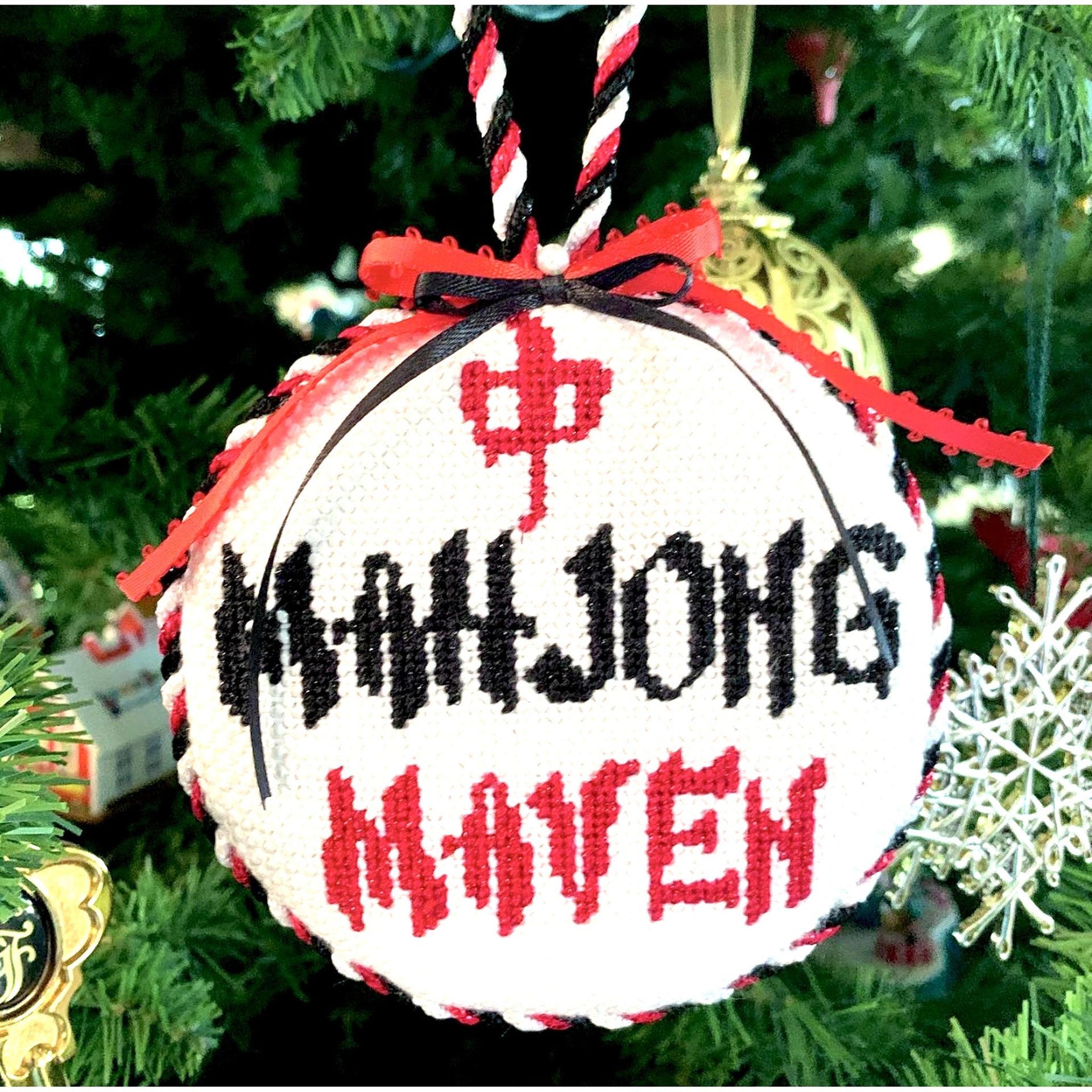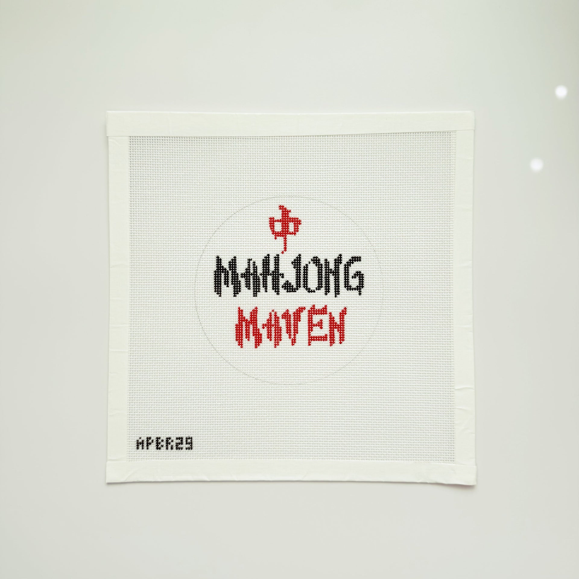 This stitch painted needlepoint canvas features the phrase "Mahjong Maven." This design captures the essence of Mahjong’s timeless appeal, blending pop culture flair with a nod to the game’s iconic tiles.