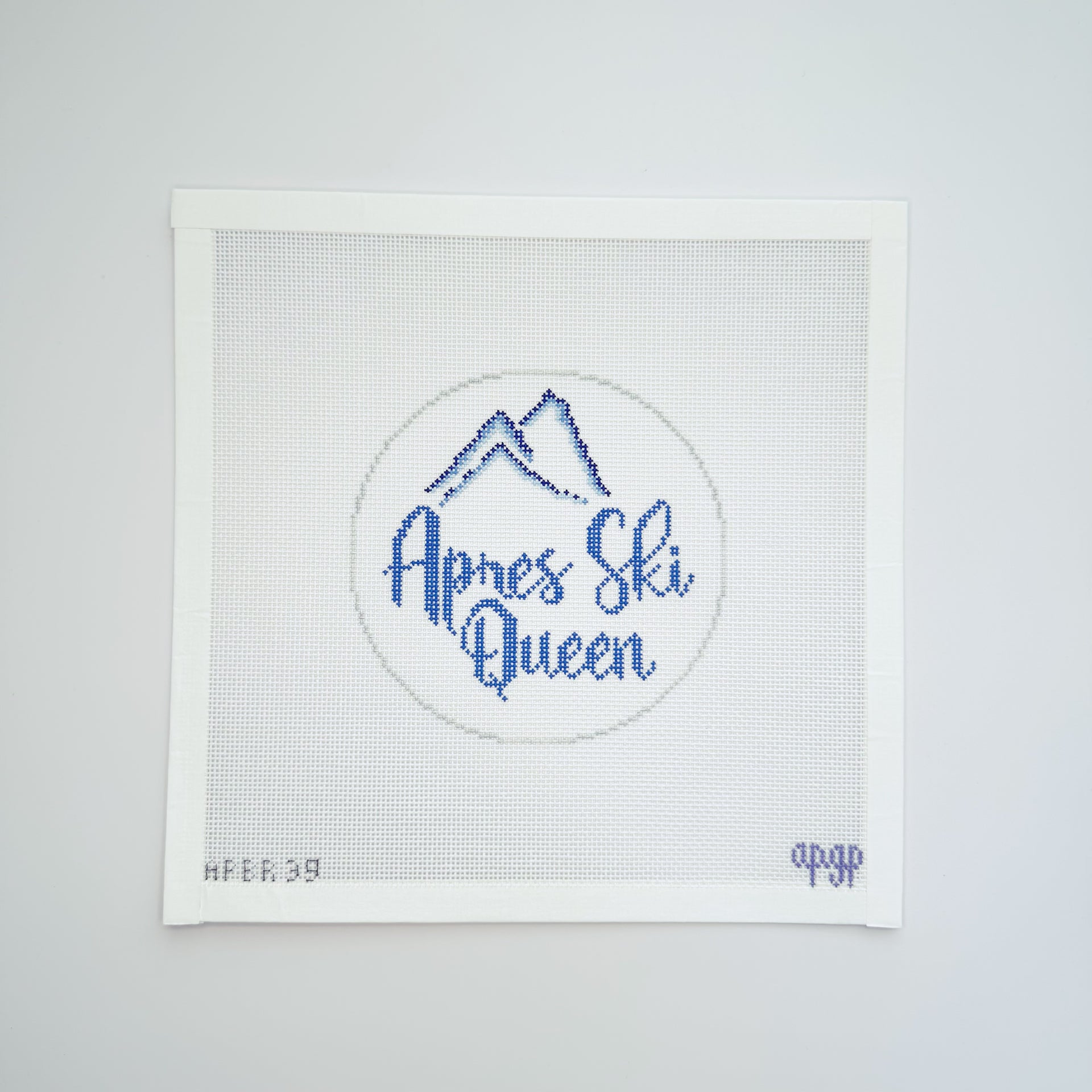 This stitch painted needlepoint canvas features the phrase "Apres Ski Queen."