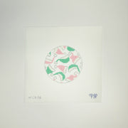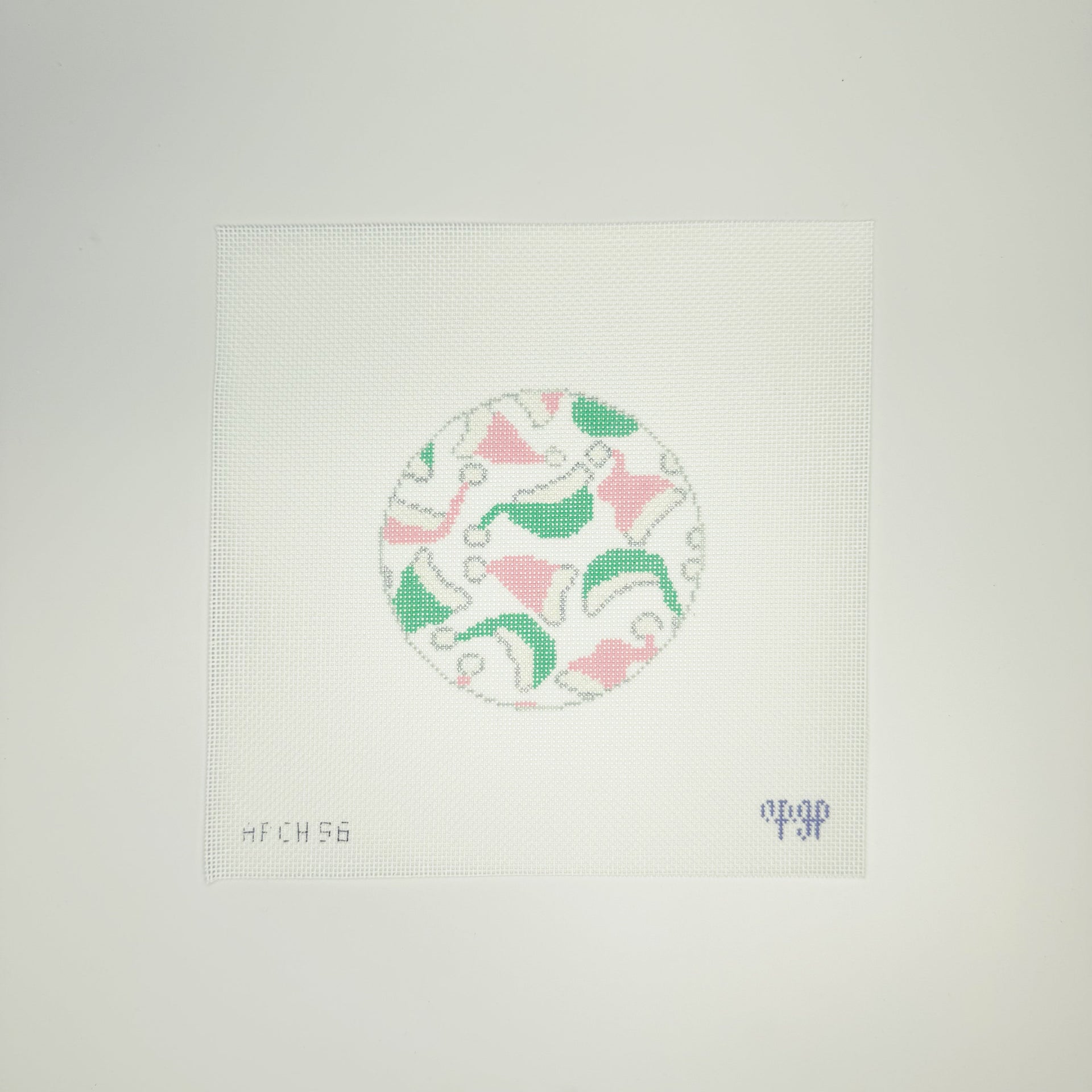 MESH: 13 mesh, DESIGN SIZE: 4" Round, DESIGNER: A Poore Girl Paints. This stitch painted needlepoint canvas features pink and green santa hats on a 4" round.