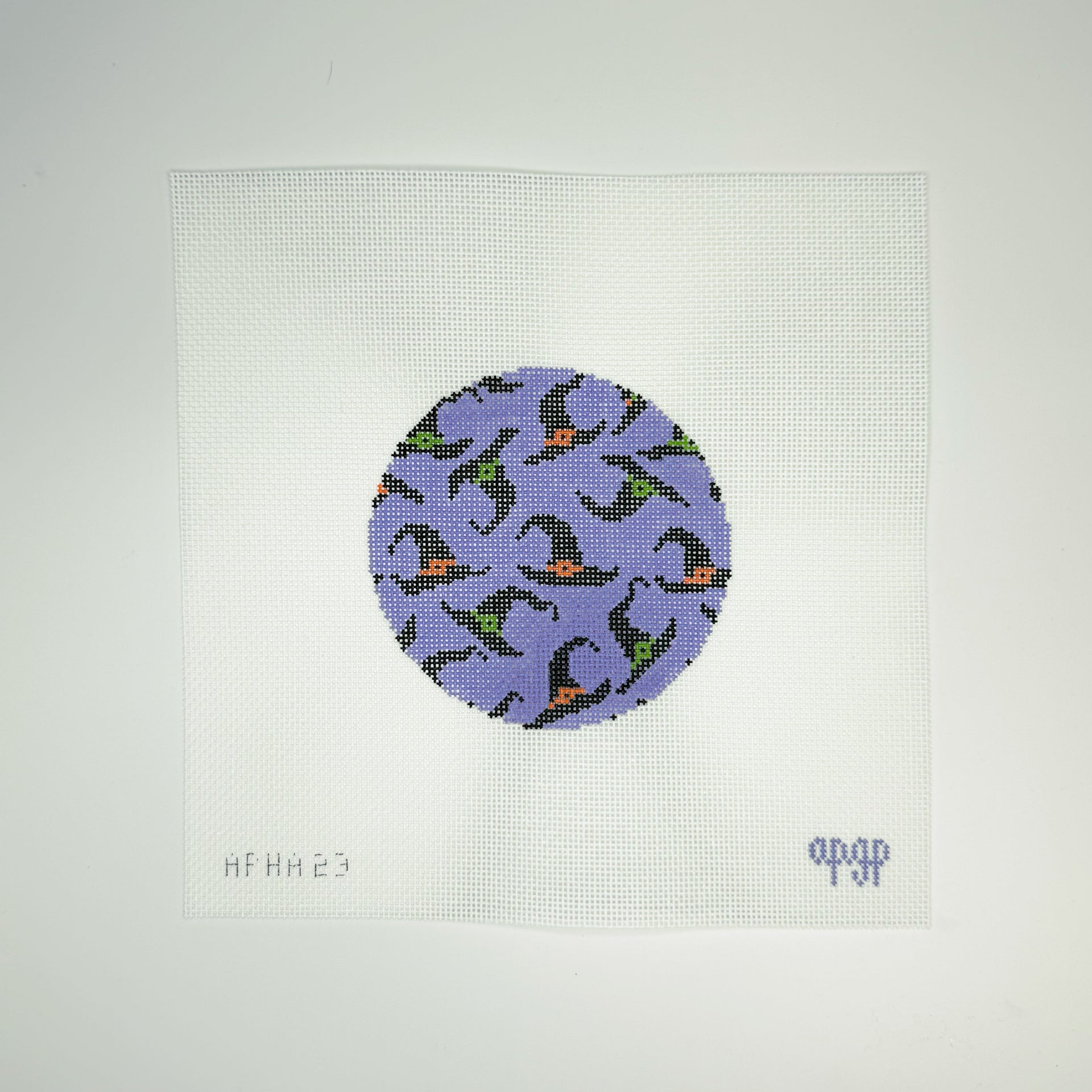 MESH: 18 mesh, DESIGN SIZE: 4” round, DESIGNER: A Poore Girl Paints. This stitch painted needlepoint canvas features whimsical witch hats on a 4” round.