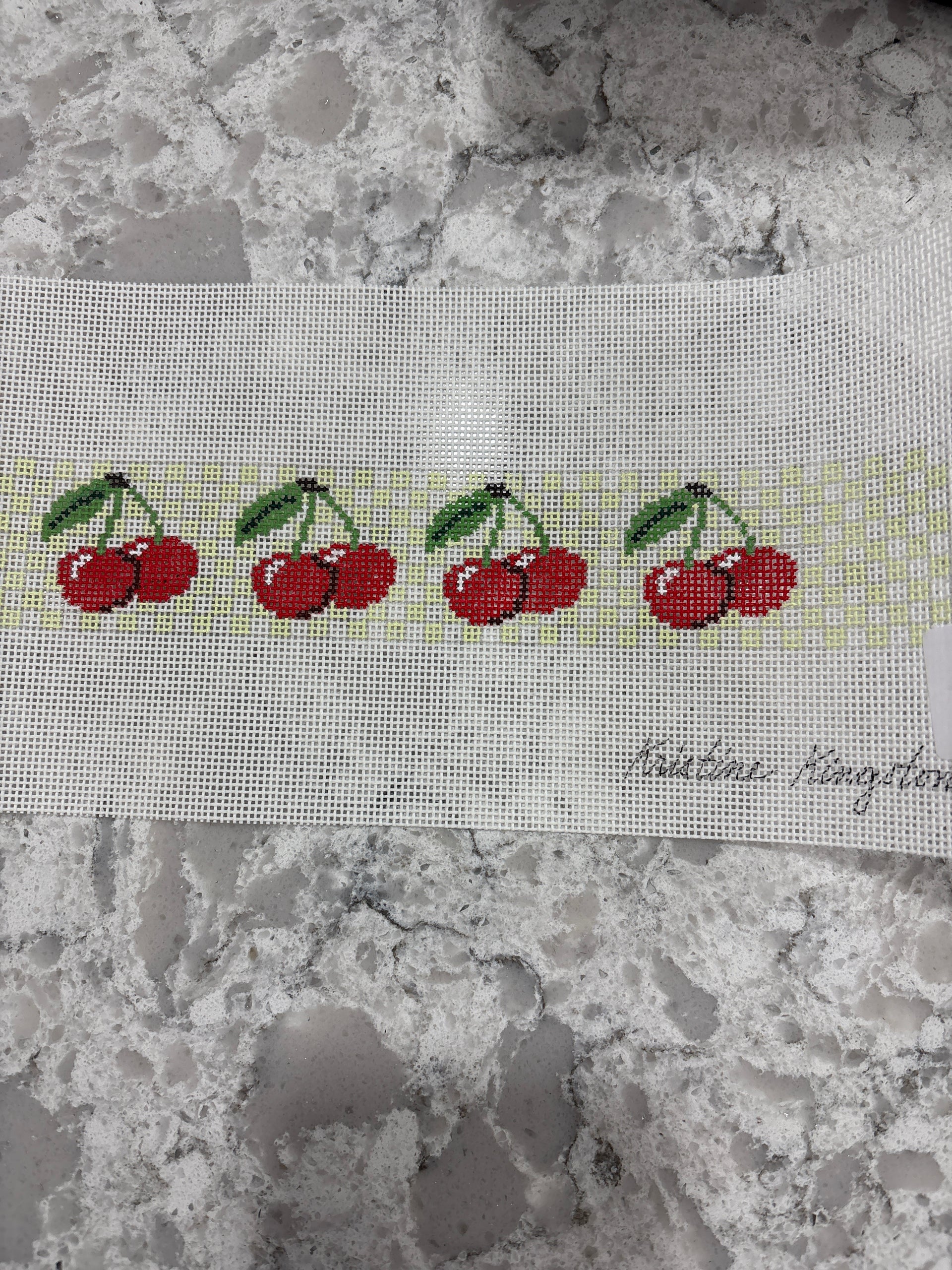 KKF09B Cherries on Green White Checks Fob, 18 mesh, Handpainted by Kristine Kingston for Chris Lewis Distributing, Design Size: 1.5 x 9"