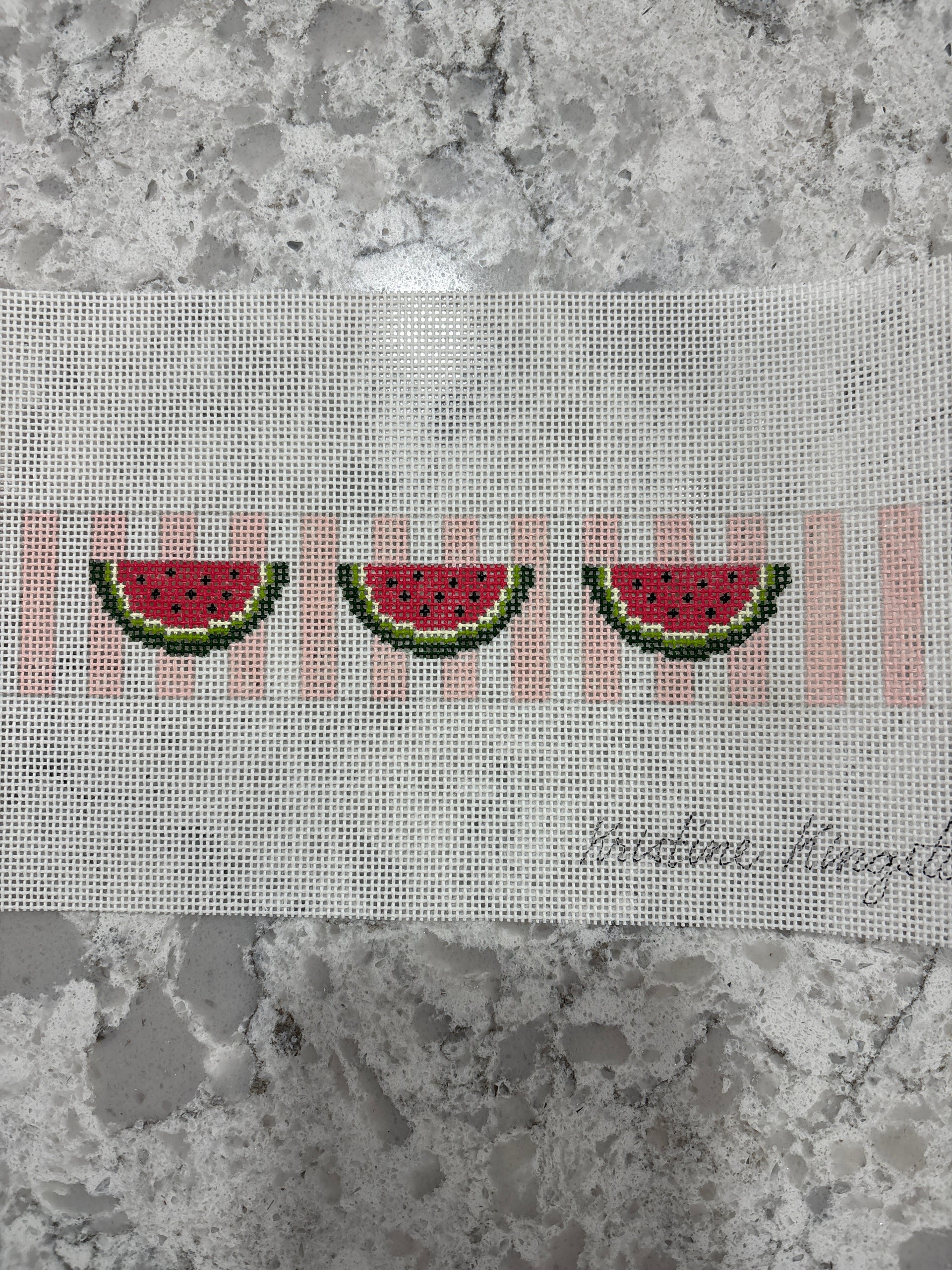 KKF10B Watermelons on Pink Stripes Fob, 18 mesh, Handpainted by Kristine Kingston for Chris Lewis Distributing, Design Size: 1.5 x 8"