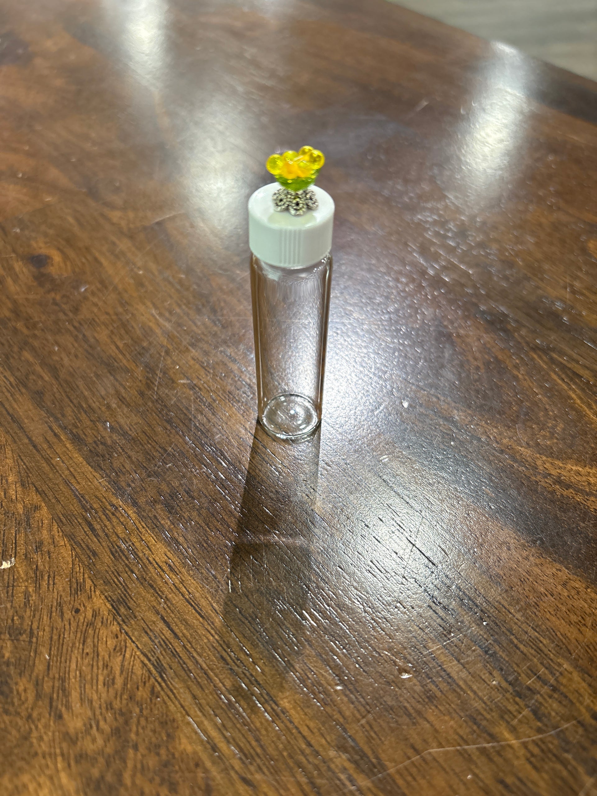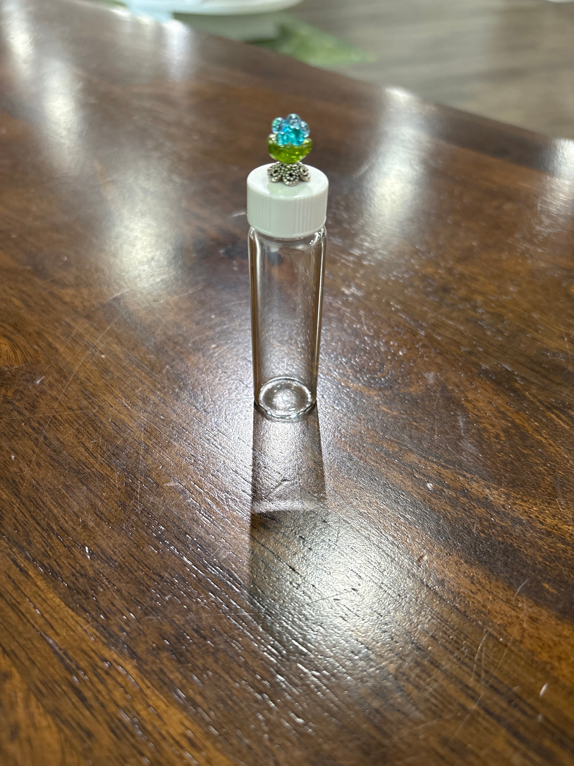 Glass Needle Vial from Merry L Needleworks. Includes a hand beaded flower topper.