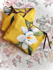 Crafted from a striking mustard yellow textile adorned with beautiful large magnolias, this basket is sure to add an artistic, elegant touch to your closet. This beautiful pouch is the perfect way to store your trinkets and treasures in style. It is sure to become a new, fresh favorite. Handmade in the U.S.A., the Magnolia Accessories Pouch is the ideal way to tote your keepsakes around in quirky, colorful fashion. This multi-functional pouch is perfect for neatly stashing makeup, needlearts supplies, charging cords, and more. Dimension: 8.00"W x 6.00"H x 2.00"D