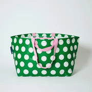 This oversized tote bag is crafted from recycled plastic; it is light, durable and has a matte finish. Has an interior zip pocket and folds for easy storage.