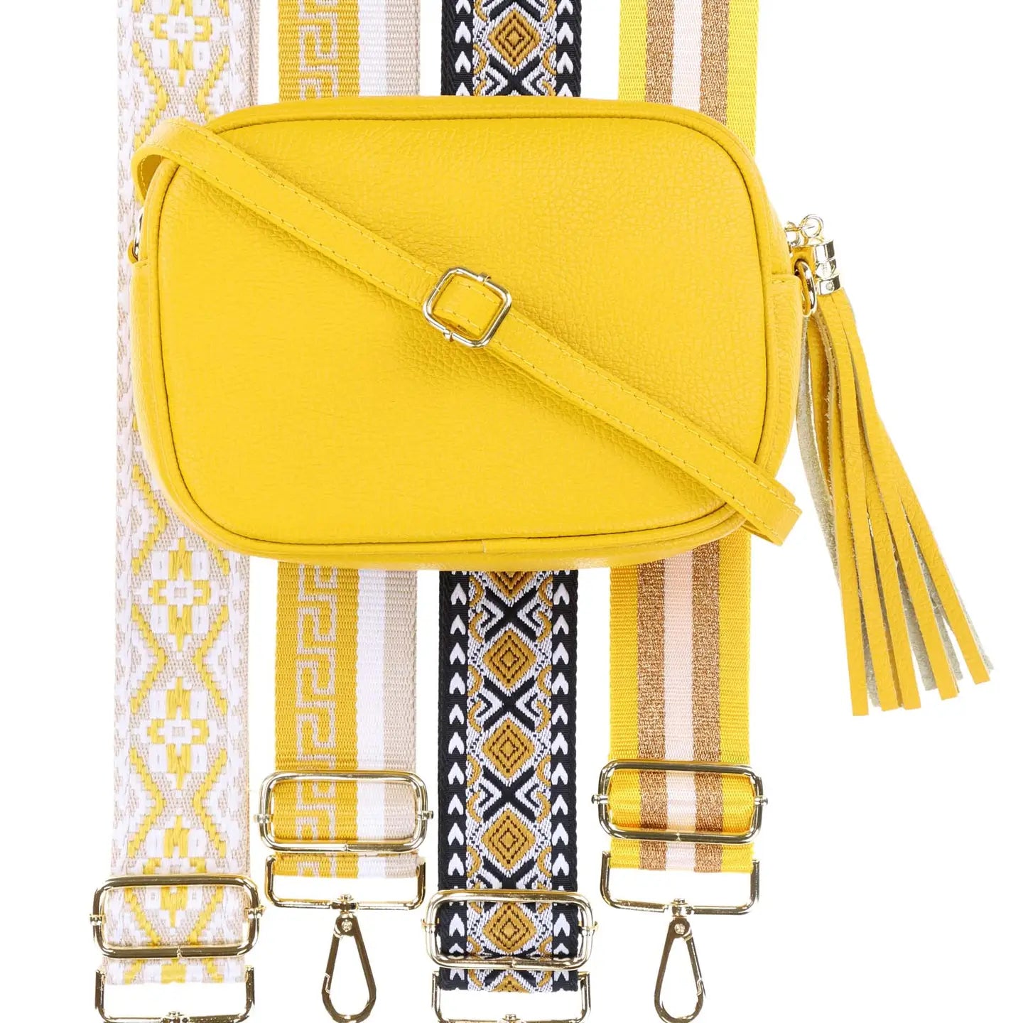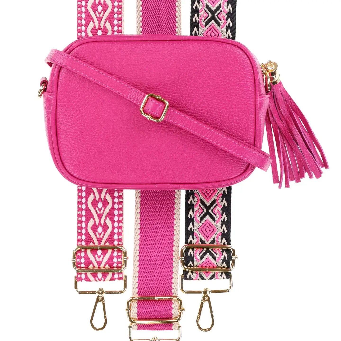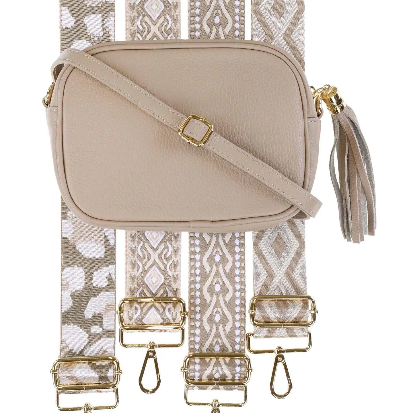 The latest crossbody bag everyone wants! Made in Italy from genuine leather, It comes with its own removable self-colored leather strap. (Other decorative straps shown in product photos are for example only and NOT included). Customize with your own needlepointed bag strap! This bag has gold colored metal zips and clips, and a leather tassel on the zip. Inside there is one compartment in camera bag style and one side internal pocket.