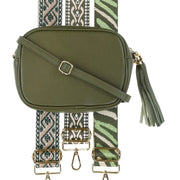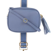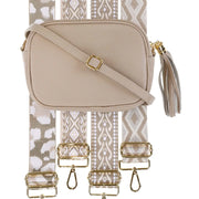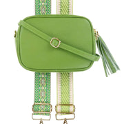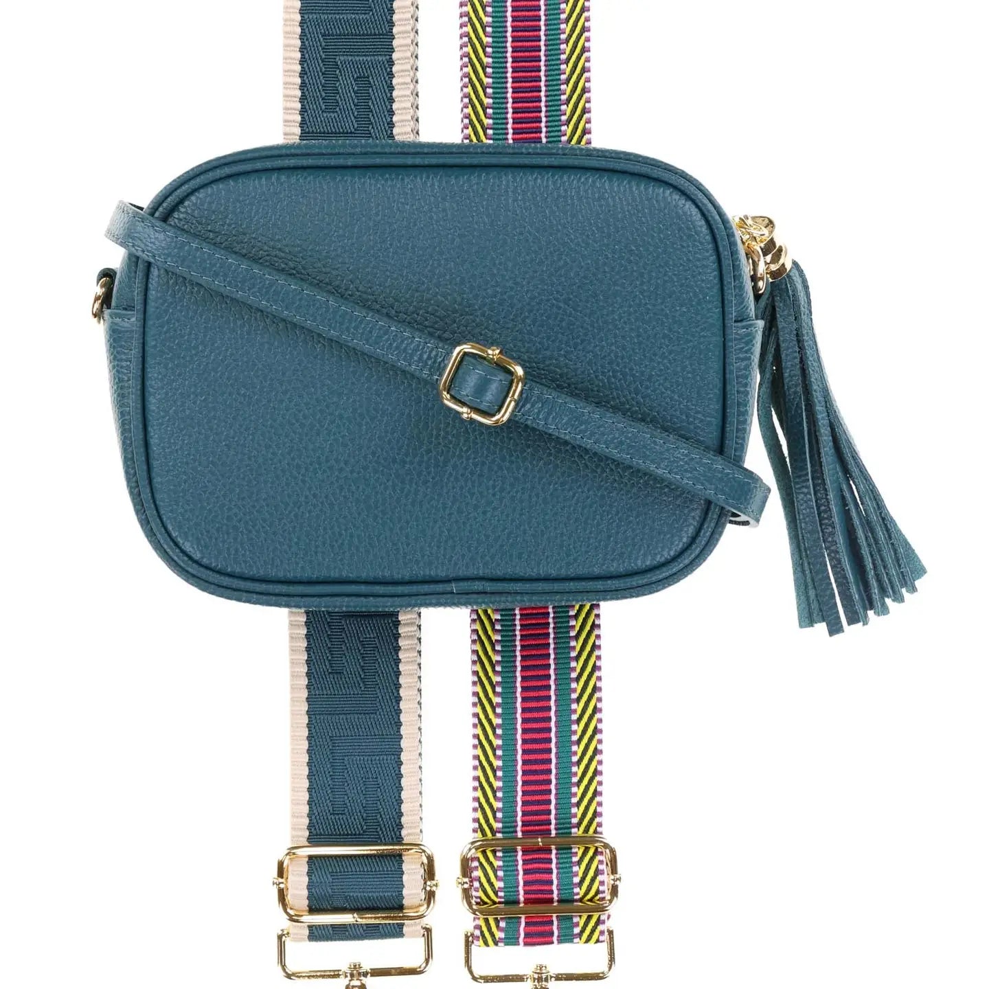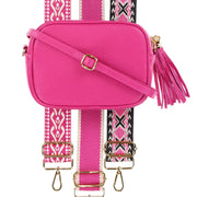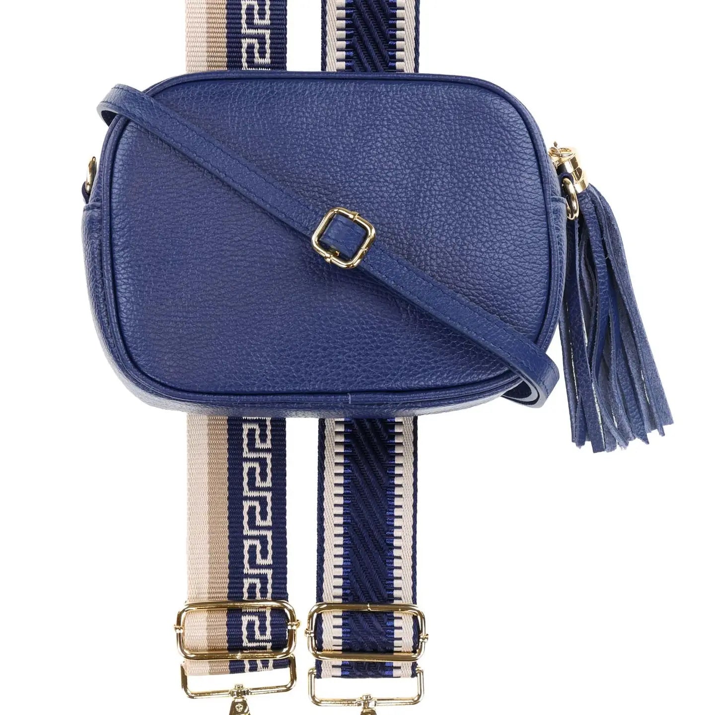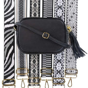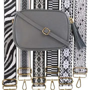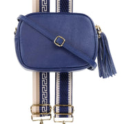 The latest crossbody bag everyone wants! Made in Italy from genuine leather, It comes with its own removable self-colored leather strap. (Other decorative straps shown in product photos are for example only and NOT included). Customize with your own needlepointed bag strap! This bag has gold colored metal zips and clips, and a leather tassel on the zip. Inside there is one compartment in camera bag style and one side internal pocket.