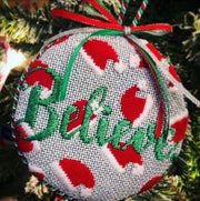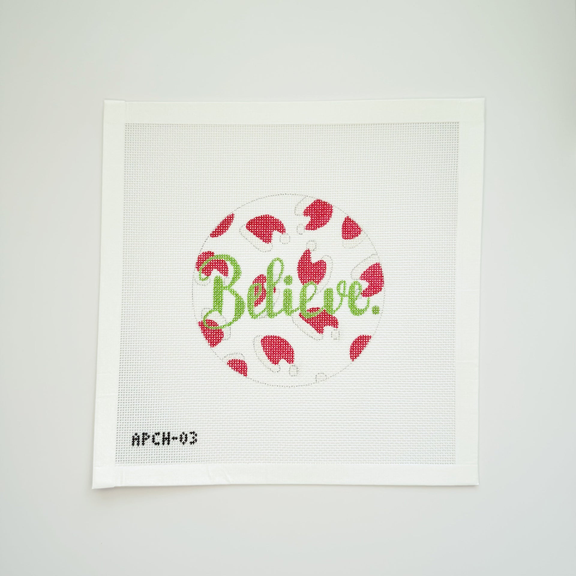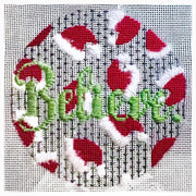 This stitch painted needlepoint canvas features the phrase "Believe" with playful Santa hats.