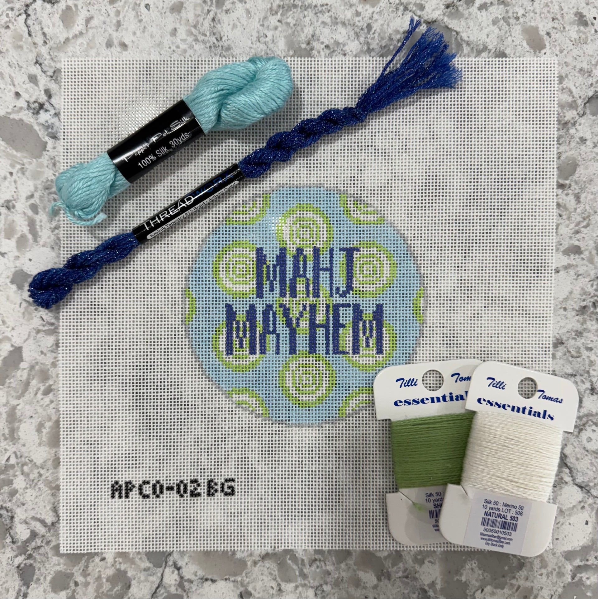 MESH: 18 mesh, DESIGN SIZE: 4” round, DESIGNER: A Poore Girl Paints. This stitch painted canvas for the mahjong lover features the phrase “Mahjong Mayhem” in a blue and green color way.