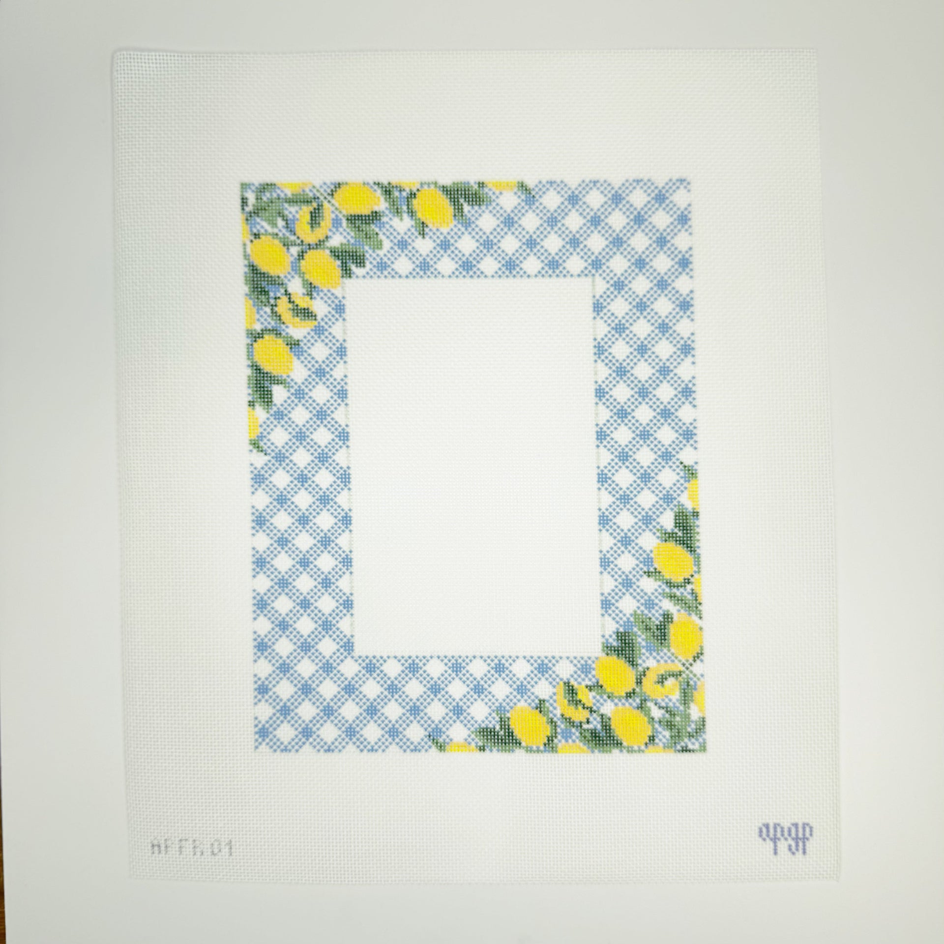 MESH: 18 mesh, DESIGN SIZE: 6.9” x 8.9”, DESIGNER: A Poore Girl Paints. This stitch painted needlepoint canvas features the signature Lemons on Blue design set on blue gingham. Intended to be finished into a picture frame.