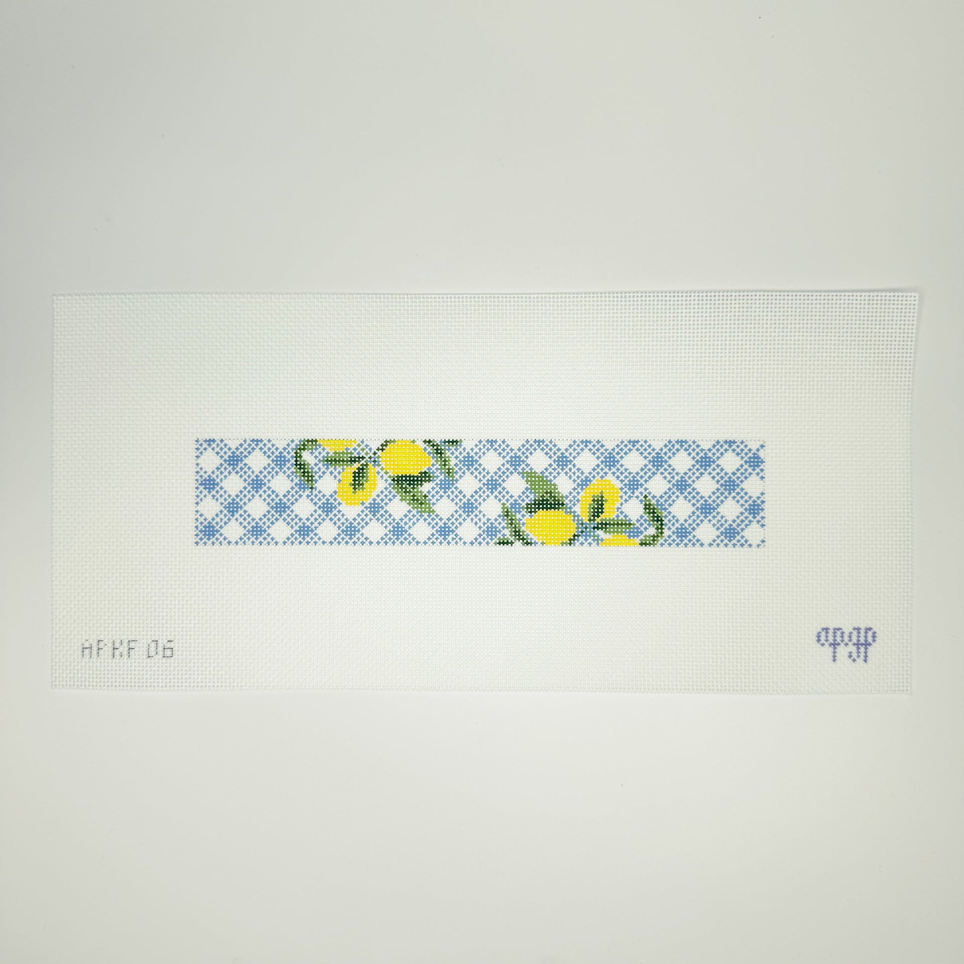 MESH: 18 mesh, DESIGN SIZE: 8.0 x 1.5", DESIGNER: A Poore Girl Paints. This stitch painted needlepoint canvas features the signature Lemons on Blue with blue gingham in a key fob size.