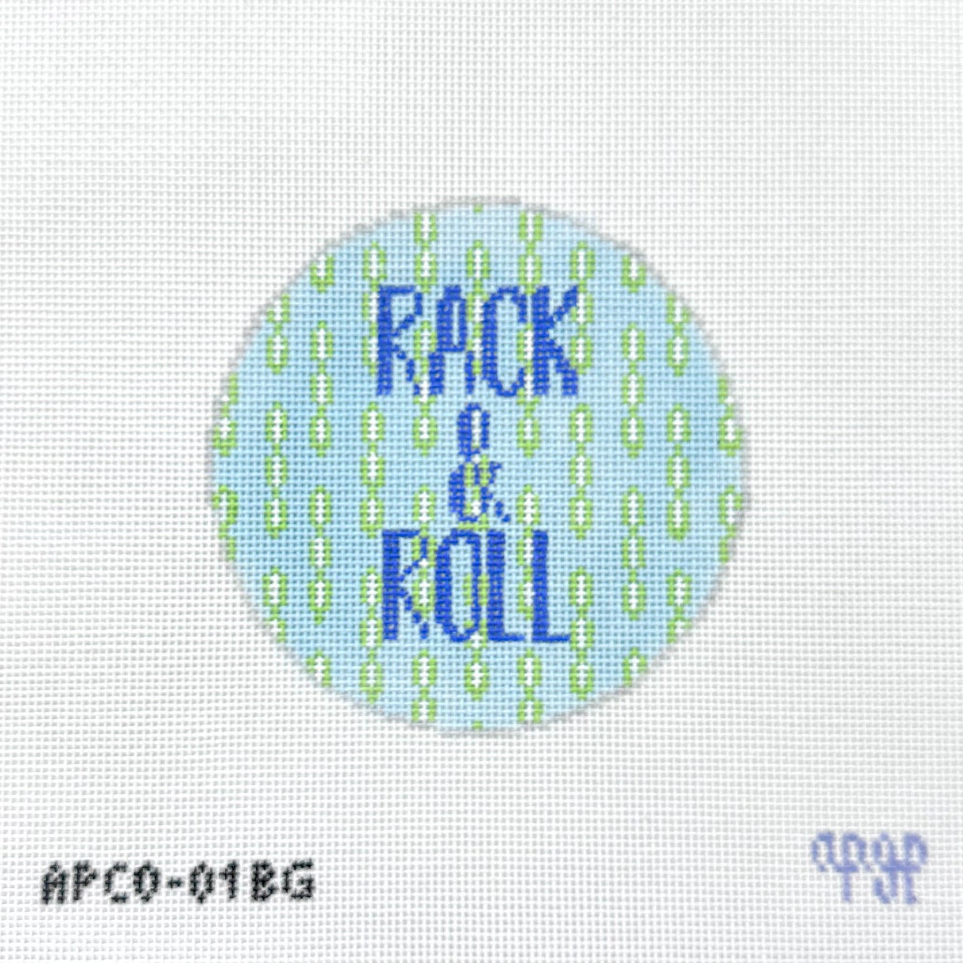 MESH: 18 mesh, DESIGN SIZE: 4" round, DESIGNER: A Poore Girl Paints. This stitch painted canvas for the mahjong lover features the phrase Rack & Roll in a blue and green color way.