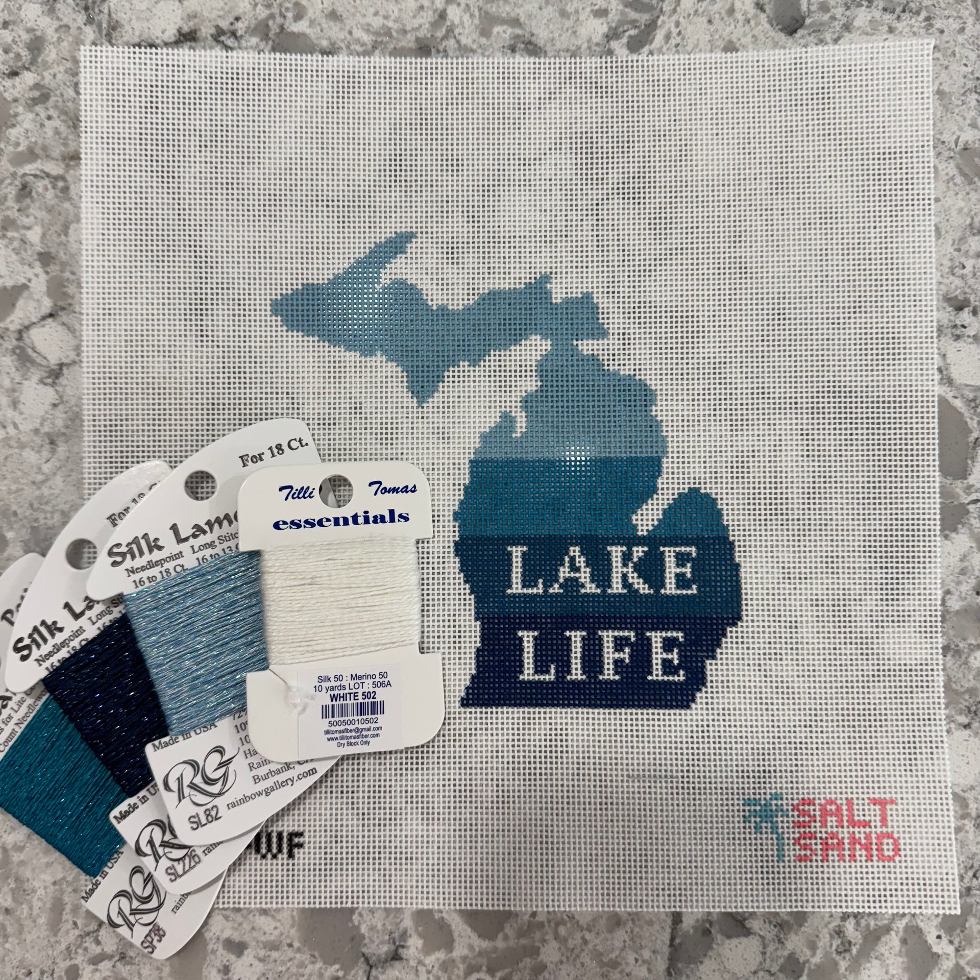 Lake Life Michigan, 18 mesh, Handpainted by Salt + Sand Designs, Design Size: 5x5”  Threads not included.