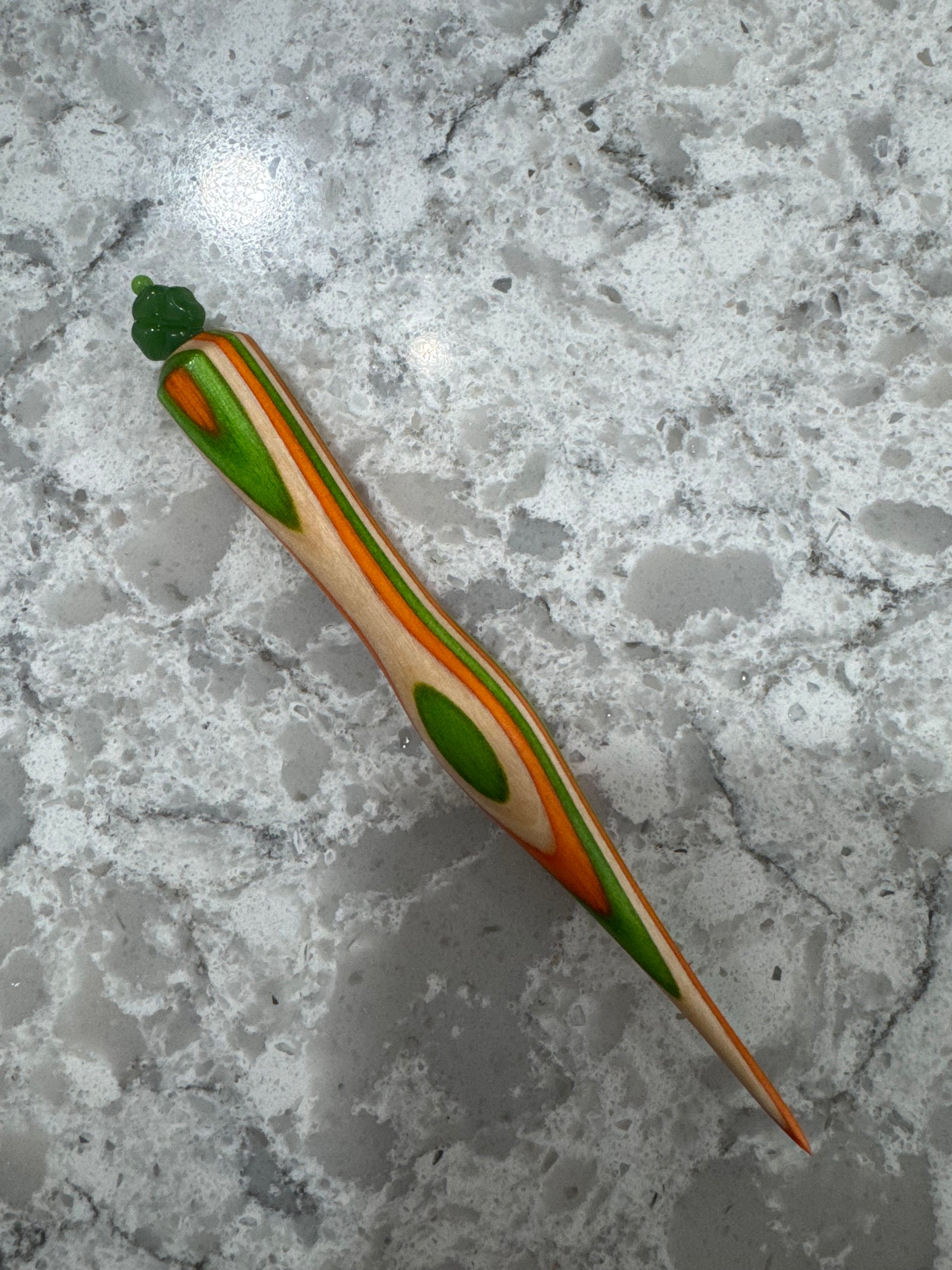 Special Edition St. Patrick's Day Handcrafted Wooden Laying Tool with Glass Bead from Sandy's Woodworking. Our woodworker has handcrafted these to feel perfect in your hand. It has just the right taper to lay your threads beautifully. These are all handmade, so designs may vary slightly from photo.