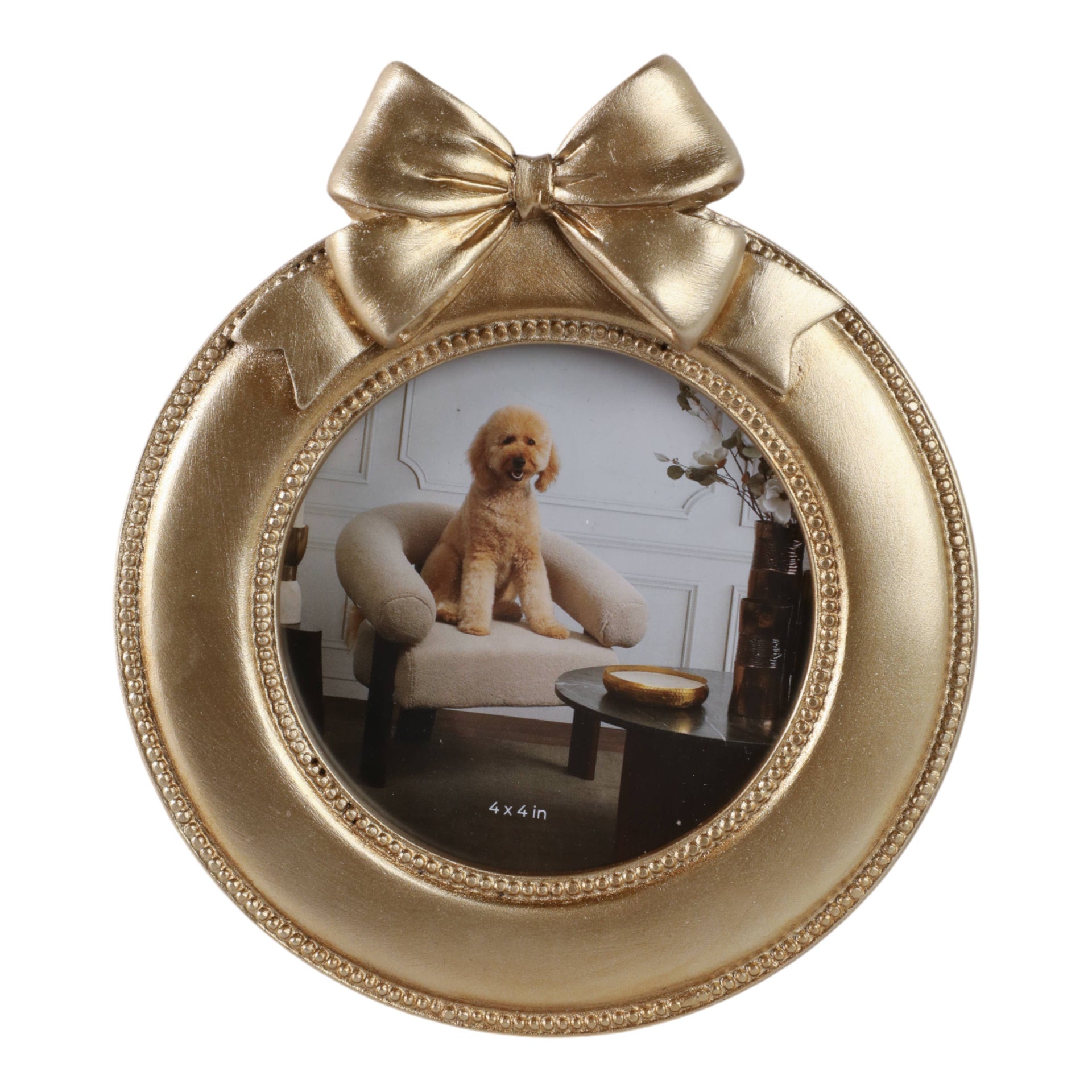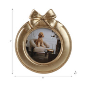 Gold 4" Round. Polyresin Glam Round Photo Frame with Bow