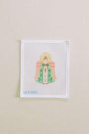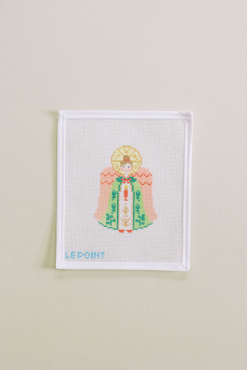 Green & Coral Angel, 13 mesh, Handpainted by Le Point Studio, Design Size: 3.5 x 4.75"