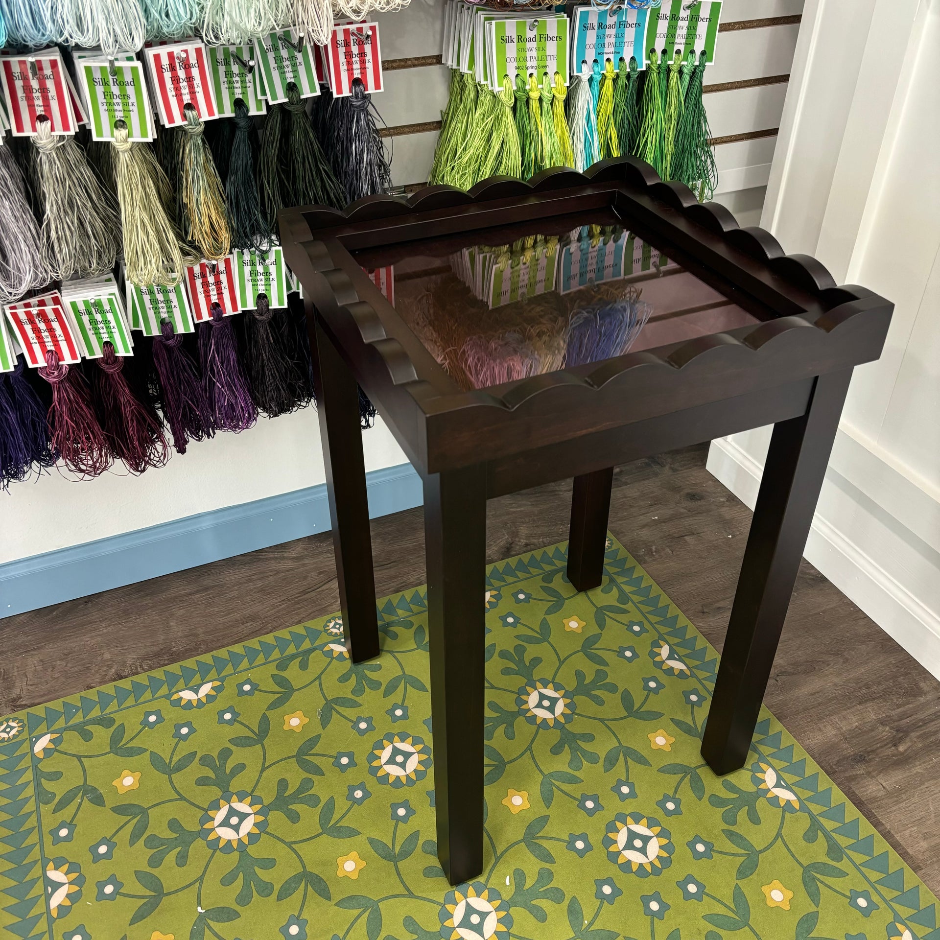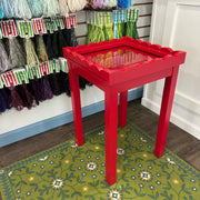 The tempered Glass top sits up from the needlepoint to accommodate ribbon or stumpwork, and to protect your projects. The table is a perfect height for by a sofa or between chairs in a sitting room.