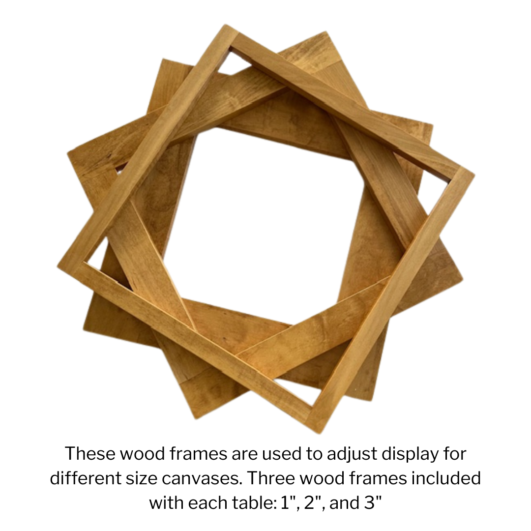 • Fits 10”, 12”, and 14” square canvases.  Adjustable display area made possible with wood frames around the outer edge of the display area. (See photo)