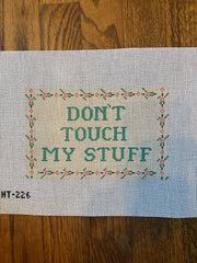 HT226 Don't Touch My Stuff, 13 mesh, Handpainted by Hello Tess, Design Size: 7.75 x 5"