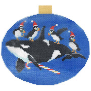 KB 1682-P Festive Sea Friends - Whale and Puffins , 18 mesh, Handpainted by Bradley Needlepoint, Design Size: 4 x 5"