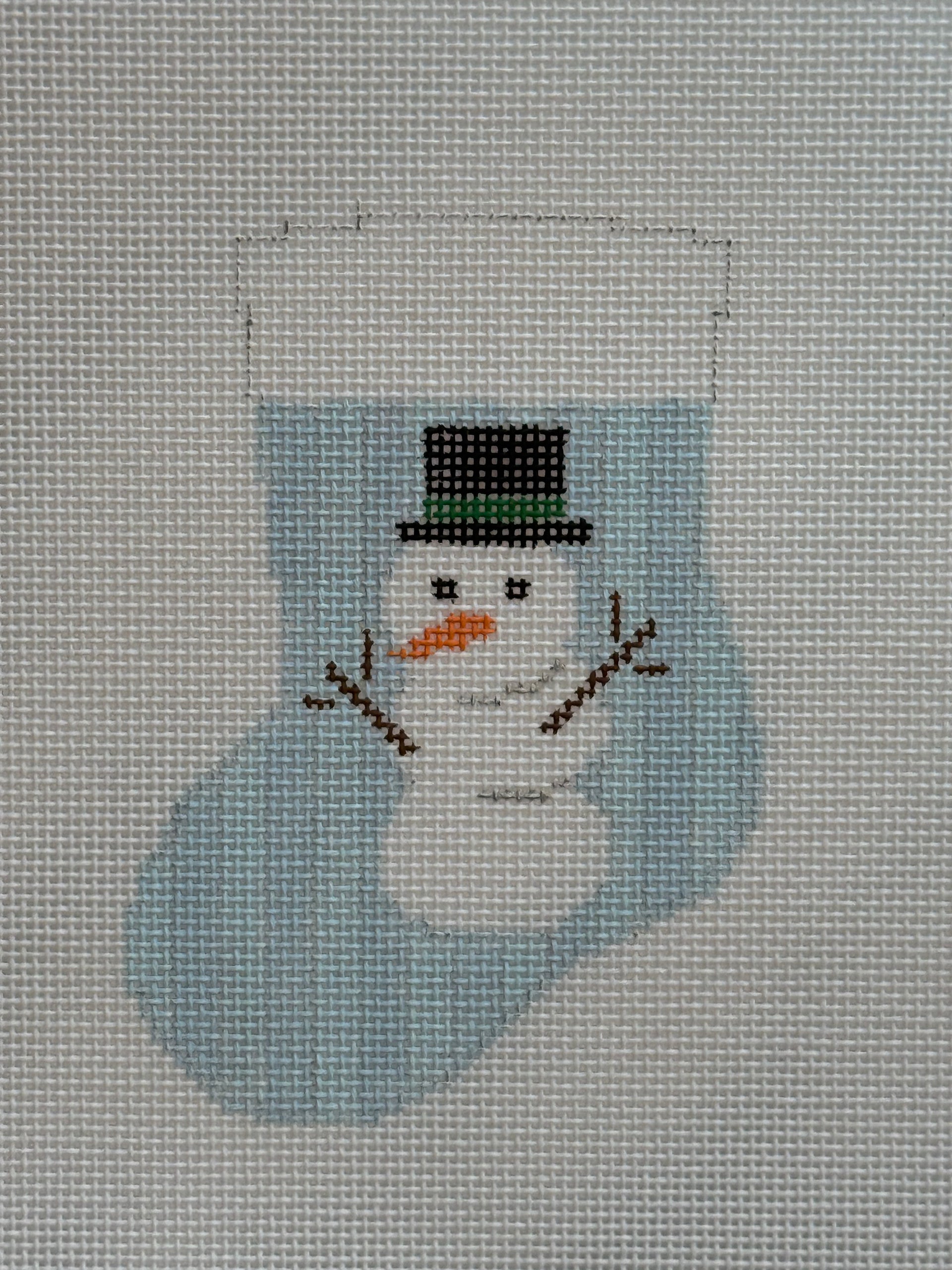 KKO244A Big Snowman on Blue Stripes, 18 mesh, Handpainted by Chris Lewis Distributing, Design Size: 4.5 x 3"