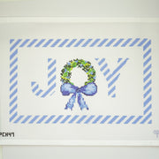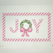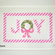 This stitch painted needlepoint canvas comes in Red, Bright Pink, Rose, or Blue, featuring candy cane-striped lettering and border, accented by a festive wreath and bow.