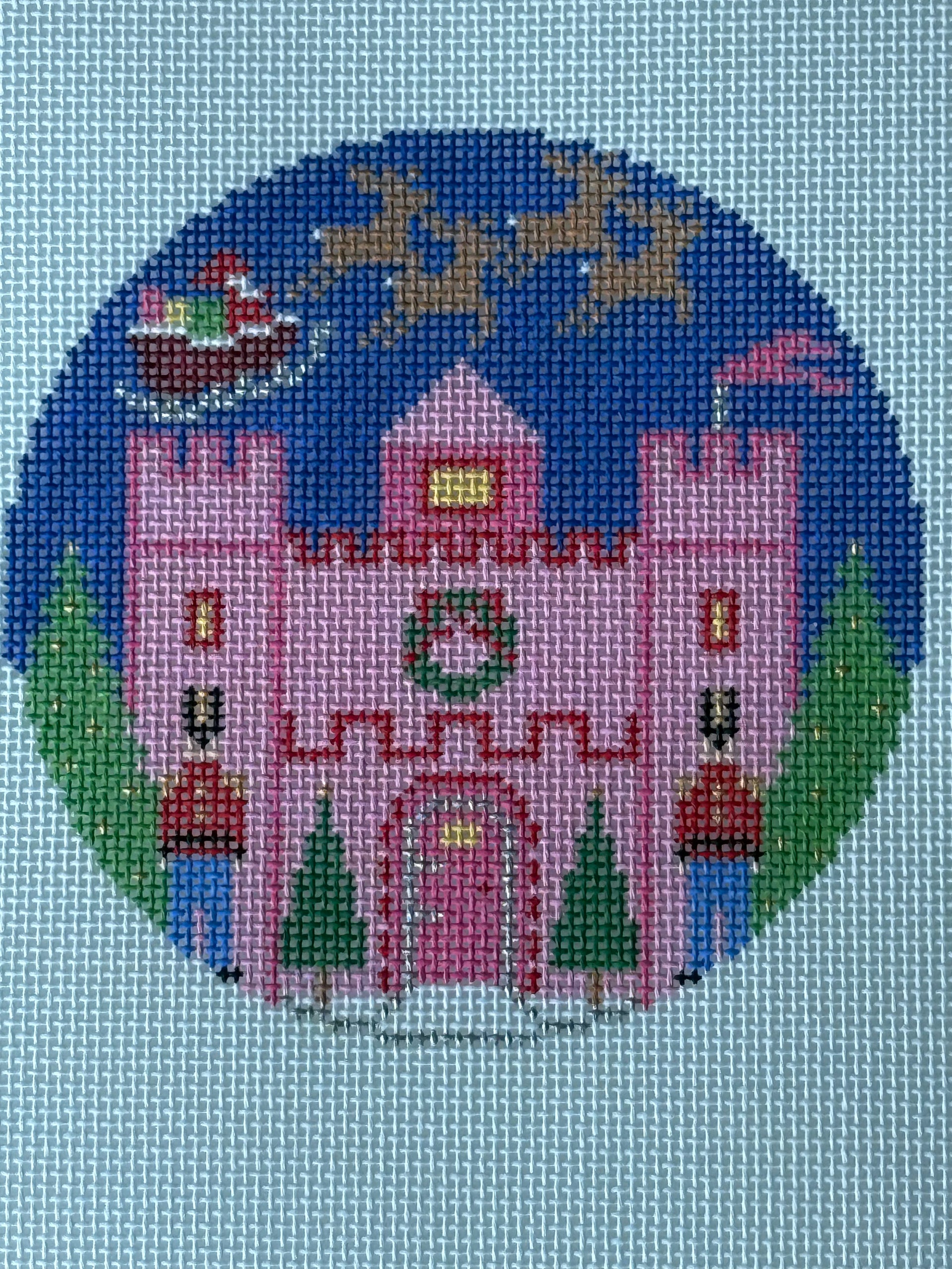 Pink Castle Round O-137 , 18 mesh, Handpainted by Doolittle Stitchery, Design Size: 4.25" round