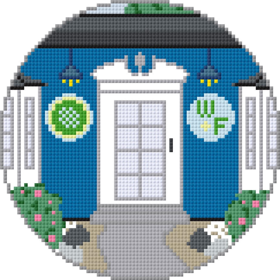 The Wool and The Floss on Mack Avenue, 18 mesh, Handpainted by A Poore Girl Paints, Design Size: 4.5" Round.